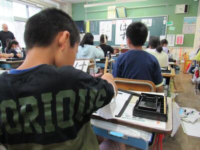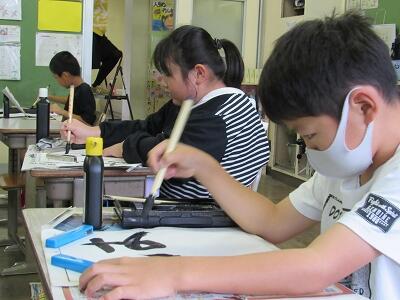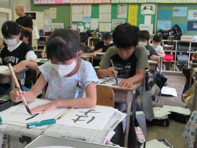 ◆4年生は、心を落ち着けて毛筆で「はす」と書いているよ。