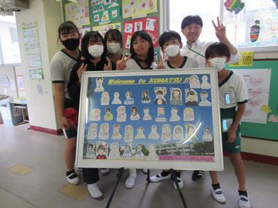 青空の下、校庭から見た校舎全景を台紙にして、「Welcome to KOMATSU!!」