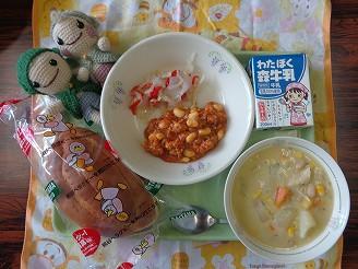 目によい食品(小松菜・じゃがいも・ブルーベリー)を使った献立です。小松菜に含まれている「カロテン」は、目の働き助けてくれ、じゃがいもに含まれる「ビタミンC」は、目をいきいきとさせてくれます。また、ブルーベリーに含まれる「アントシアニン」は、疲れた目を回復させてくれる働きがあります。