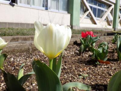 1年生の教室前の花だんにチューリップの花が咲きました。