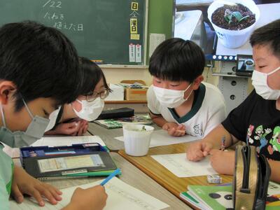 題材になりそうな情報を端末で調べたり、下書きを始めたり、「個別最適な学び」を進めているね。