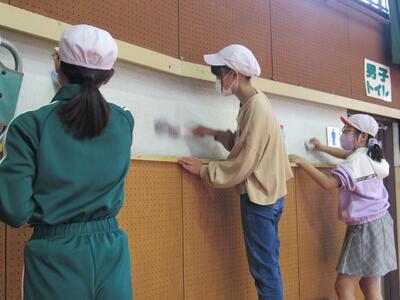 ◆今朝は、6年生が家庭科で玄関を清掃しているよ。