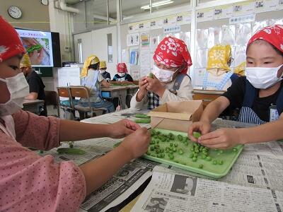 ◆2年生は、給食で使われるグリンピースの皮をむこうとしているよ。