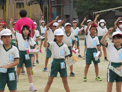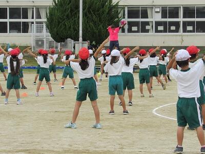 ◆最後は、3・4年生が校庭に集合し、表現運動のレベルを上げていっているよ。