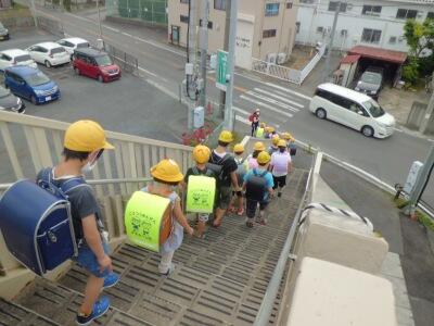 約200名の児童が国道4号の歩道橋を渡って下校します。