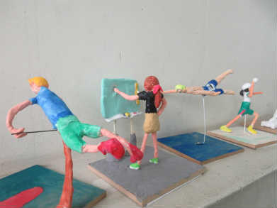 電動糸のこぎりで形を切り取り、色づけをした作品の鑑賞会です。