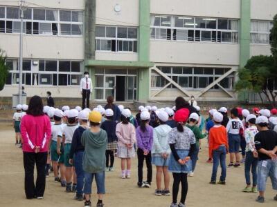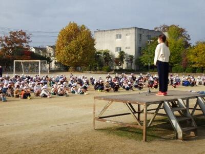 Google Meet の朝会が続いていましたが、今月は校庭で行いました。
