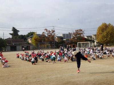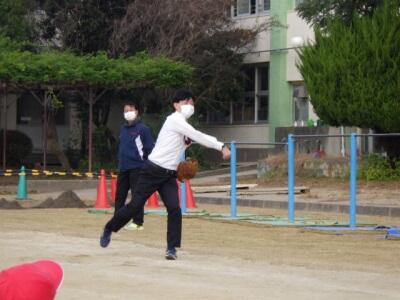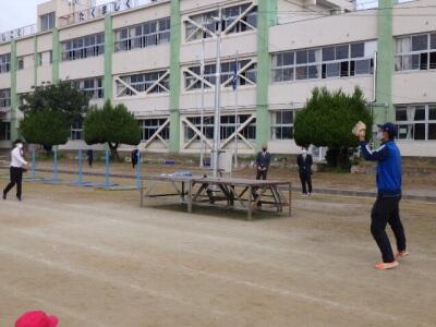 先生の特技は遠投。体育小屋前の校長先生のところまでボールが飛んでいきました。