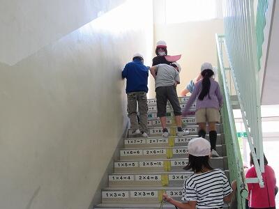 さすが2年生です。階段を隅々まで丁寧に清掃します。 ピース!