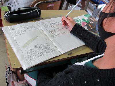 ◆となりの4年生は、校庭で見つけた「春の生き物」のスケッチを基に話し合います。