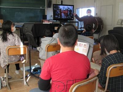 ◆4年生が音楽室で、伝統芸能を鑑賞しているよ。