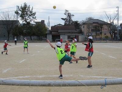 ◆5年生の体育の研究授業「ハンドボール型ゲーム」。まずは、今日のねらいを確認中!!