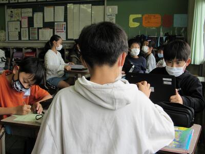 ◆5年生の国語は、報告書に書き込む内容を話し合っているよ。