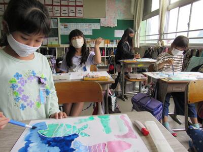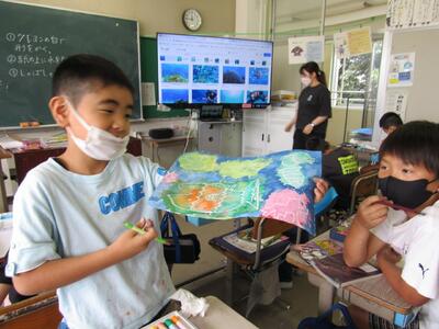 ◆3年生は、白いクレヨンで魚を描き、この後、絵の具で色をつけていこうとしているよ。