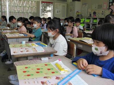 ◆1年生の算数は、黄色いブロックを使ってチューリップの数を数えているよ。