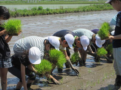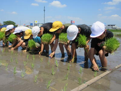 ★本日5年生が、白石農園(幸松小学校ファーム)で田植え体験をさせていただきました。