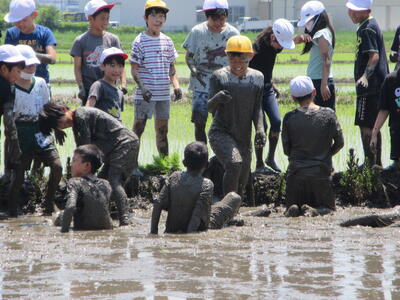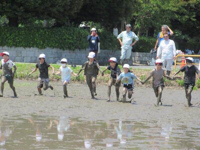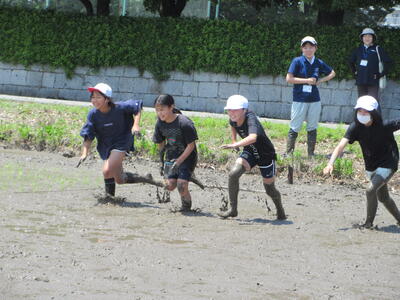 ★途中、農家の方のご配慮で、希望者は田んぼを走ることができました。田んぼ競争等、よくニュースに出ていますね。農家の方は「田んぼを走る経験は、もう一生ないかもしれませんね」とおっしゃっていました。みんな最高の笑顔で走っています。とても楽しそうです。(この後が大変そうですが)