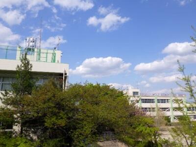 天気がよい校庭に子どもたちが来ています。絵画のようです。