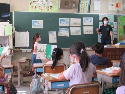 ◆1年生は、「くじらぐも」の場面絵を基に話し合っているよ。