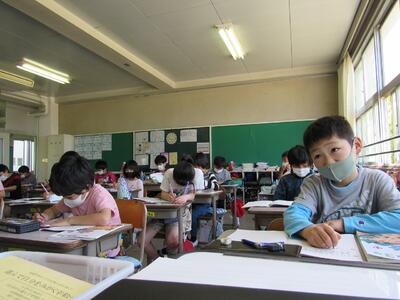 ◆3年生は、算数の授業が始まり、問題をノートにしっかりと書いているところだよ。