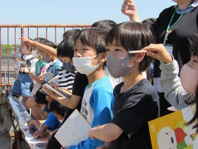 ◆3年生は、屋上に上がって、東西南北の方向に何があるか調査をしているよ。