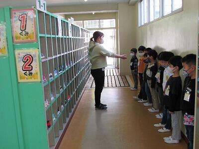 ◆1年生は、昇降口の使い方を学習中。「楽しいです。」と言っています。