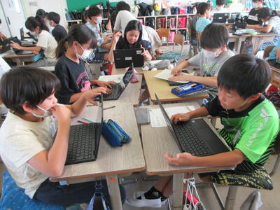 ★国語の時間に物語を学習してきたまとめの感想をタブレットで読み合っていました。友達の感想を読み、その感想をさらにタブレットで打ち込みます。タブレットパソコンを活用することで、個々が集中してじくりと感想交流することができました。