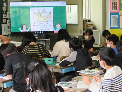 大画面や板書の立体図形をよく見て、求め方を考えているよ。