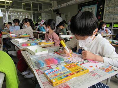 ◆1年生の図工では、こいのぼりの絵が仕上がってきたようだよ。