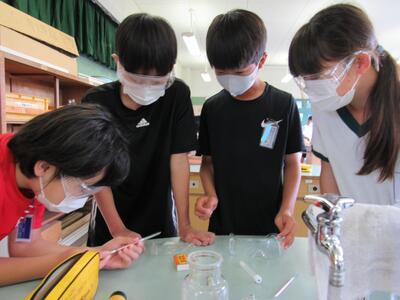 ◆6年生が集気びんの中でろうそくを燃やし、空気がどのように変わるか実験しているよ。
