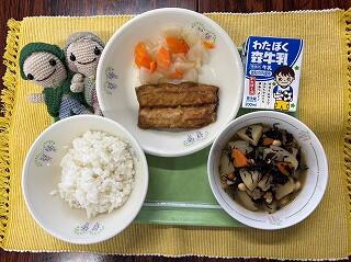 五目煮は、にんじん、たけのこ、ごぼう、こんにゃくなどの具材を、調理員さんが手で丁寧に1cm位の大きさに切って調理しているため、味が均一にしみ込み、美味しく仕上がりました。