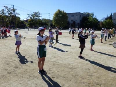 ロング昼休み。校庭では金管バンドクラブが運動会の演奏の練習をしていました。
