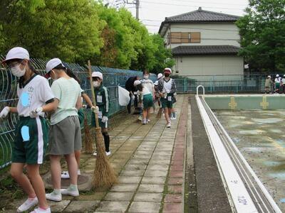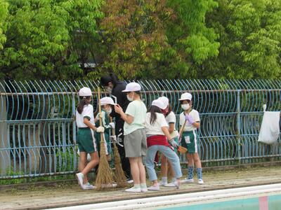 本校では、まず、働き者の4年生がプールサイドをきれいにしていきます。