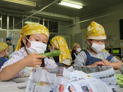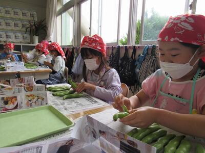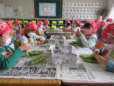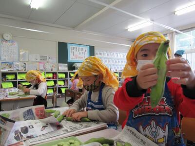 ◆今日の給食は、1年生が皮むきに挑戦する豆が食材になりますよ。