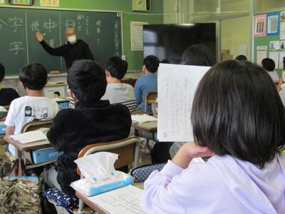 ◆となりの4年生は、地図帳を片手に、都道府県名に関する漢字を練習しているよ。