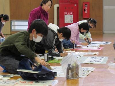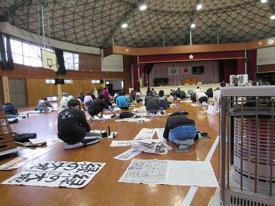 ◆体育館では、6年生が小学校での最後の書きぞめ競書会に挑んでいるよ。