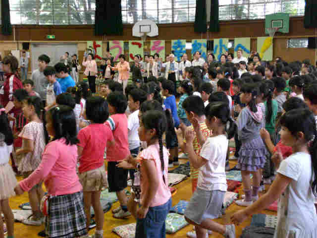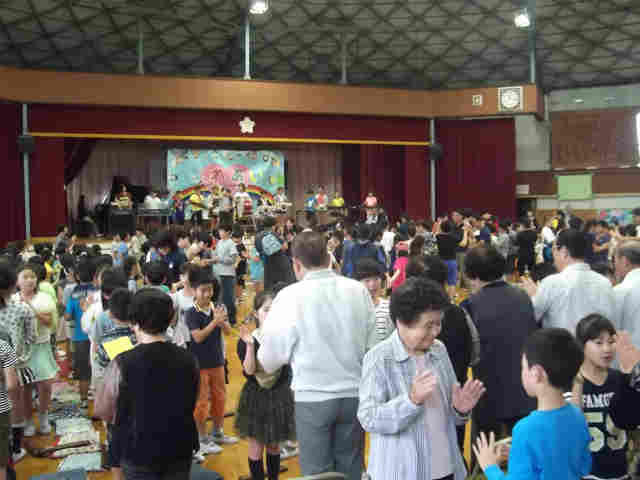 幸松小学校体育館で、春日部特別支援学校のお友達、松寿会の皆様を