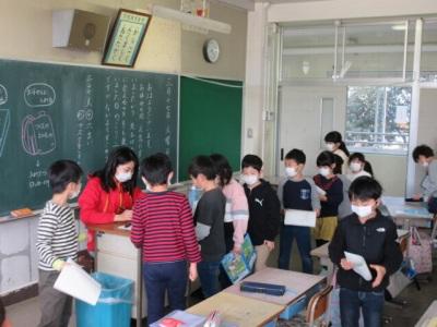 4年生の教室の黒板には、11月に作った臨床美術の作品がありました。