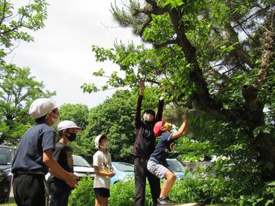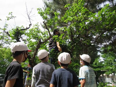先生が木に登っています。高いところにある実に手がとどくかな?