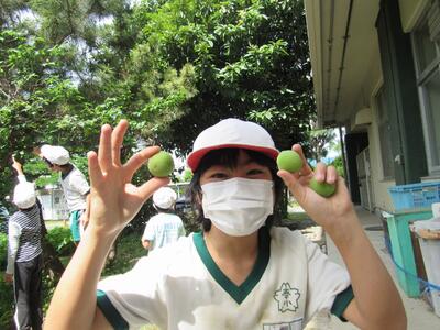 ◆1時間目に、「たんぽぽ・ひまわり学級」は、梅の実を収穫しているよ。