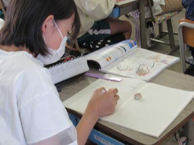◆4年生の図工は、木々を見つめて思い思いの木を描いているよ。