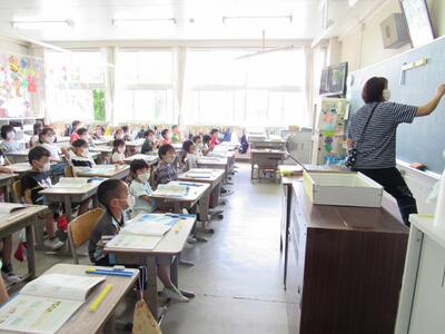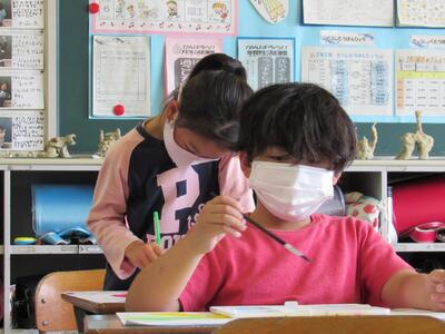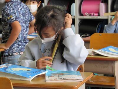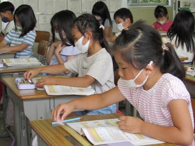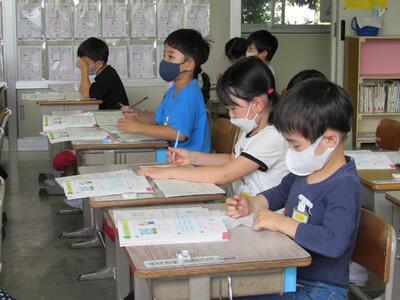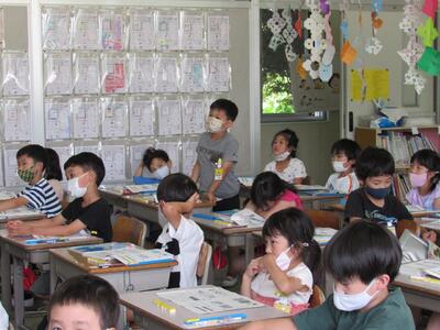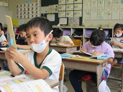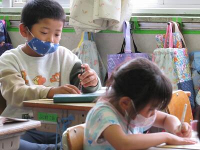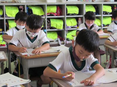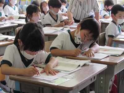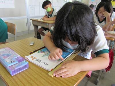 ◆1年生は、伸ばして発音する言葉を声に出したり、書いたりしているよ。