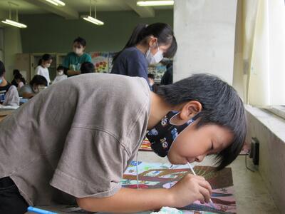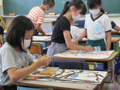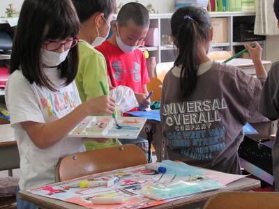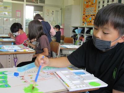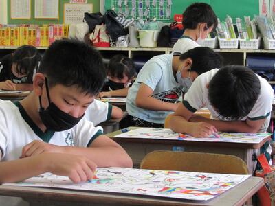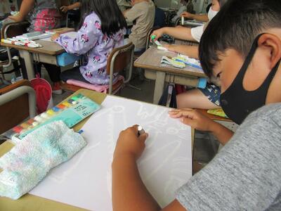 ◆3年生は、白いクレヨンで魚を描き、この後、絵の具で色をつけていこうとしているよ。