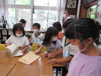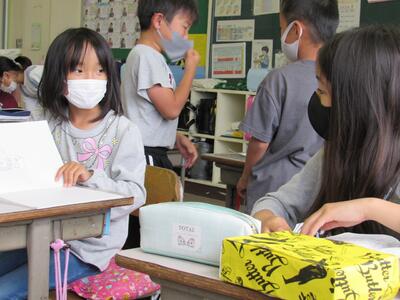 ◆1時間目の休み時間、5年生と2年生が校長室へノートを参考にしたいとやって来ています。