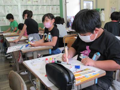 ◆3年生は、こんな魚がいたらいいなあと想像しつつ、絵を描いているよ。