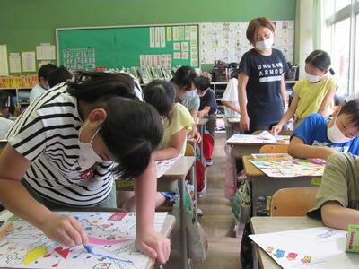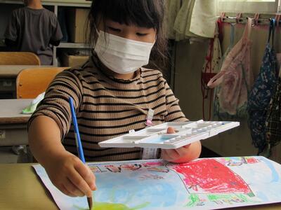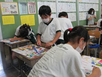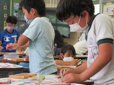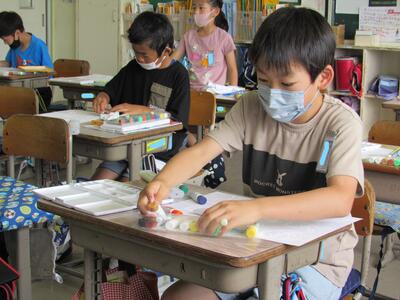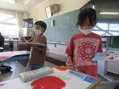 ◆2年生が、大好きな野菜の絵を、思い思いの色を使って描いているよ。