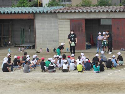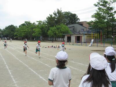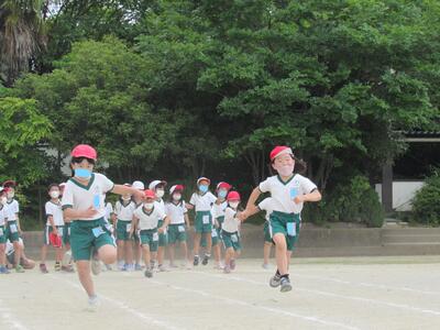 ◆2年生が、リレー遊びで走力をアップしようとしているよ。