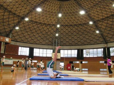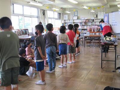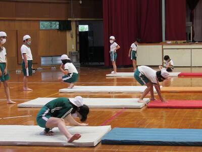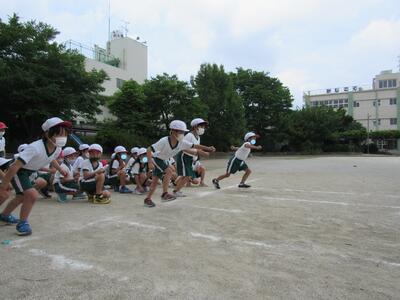 ◆となりの1年生は、水泳学習の準備運動を学んでいるよ。