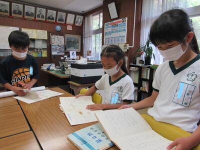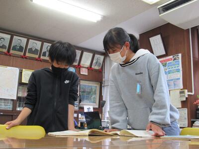 ◆業間休みに、6年生2人が自主学習のヒントを得ようと校長室へ。