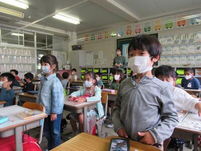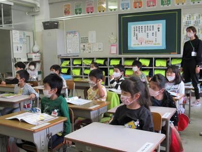 笑顔で教室へ。実習生の先生も「幸松っ子」です。